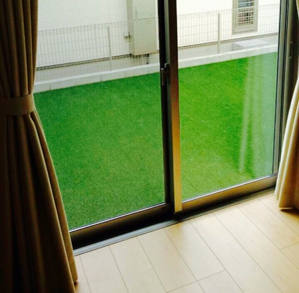 室内から眺める人工芝もいいものです。外に出なくても美しい緑を楽しむことができますよ。